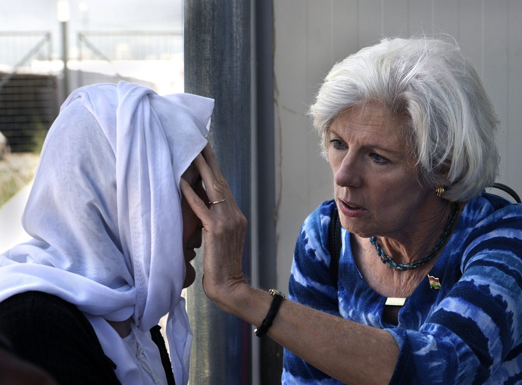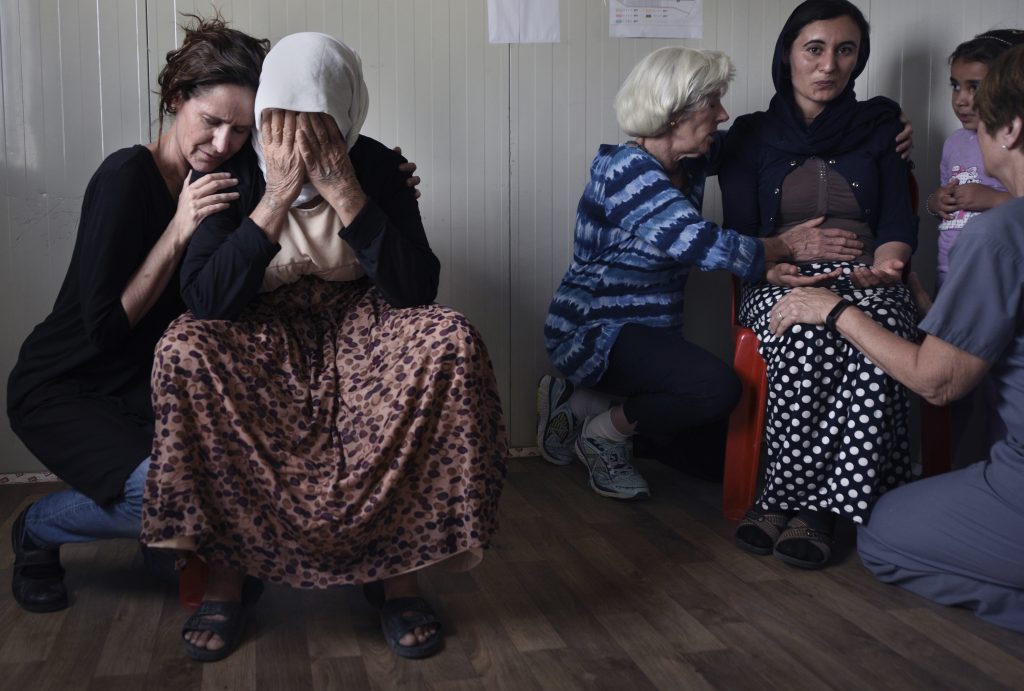Dunya Walid, 29 years old, weeps about the loss of her husband who thought she was in their bombed home as she speaks with team member Carol Rogers Smith. He died after they fled ISIS, holding her hand and putting his wedding ring on her finger. She said to Carol “I hope I meet you in heaven. This is my story, this is my life. I love you. You are my family.” The Yazidi live in a makeshift camp in Babilo just discovered by NGO Love for the Least. on May 12, 2017. The Yazidis were targeted starting in 2014 by ISIS in an effort to “purify” Iraq. They were the victims of persecution, massacres and genocides and remain largely unwanted by most societies. Love for the Least, a grass roots Christian non-profit, leads a medical mission. The team administered needs to all faiths including health care, healing prayers and tender comfort especially for emotional trauma and PTSD to those living in limbo as the fierce battle continues to wage in Mosul. The NGO brings acute and long-term relief to Iraqi, Syrian, Kurdish, Yazidi and all families affected by the war.