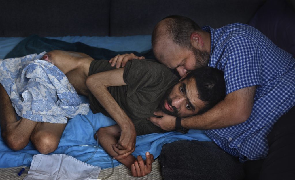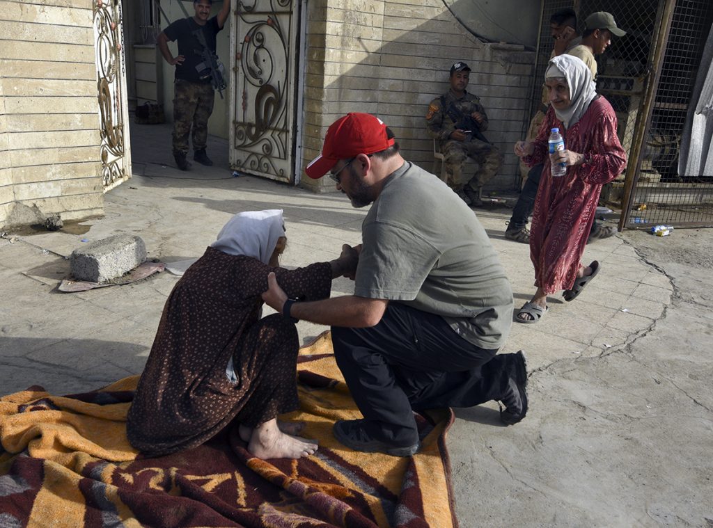 Jerry Kramer with NGO Love for the Least that cares for IDPs in camps near Dohuk visits Mosul. Civilians, many injured and weak, flee the continued battle with ISIS in West Mosul on July 3, 2017. They are brought to a trauma stabilization site near the Old City.