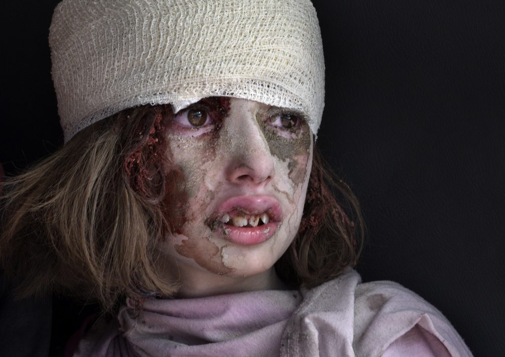 An injured girl arrives at a medical trauma stabilization point near the Old City as civilians, many wounded and weak, flee the fierce battle with ISIS in West Mosul amid ruins of the city on July 6, 2017.